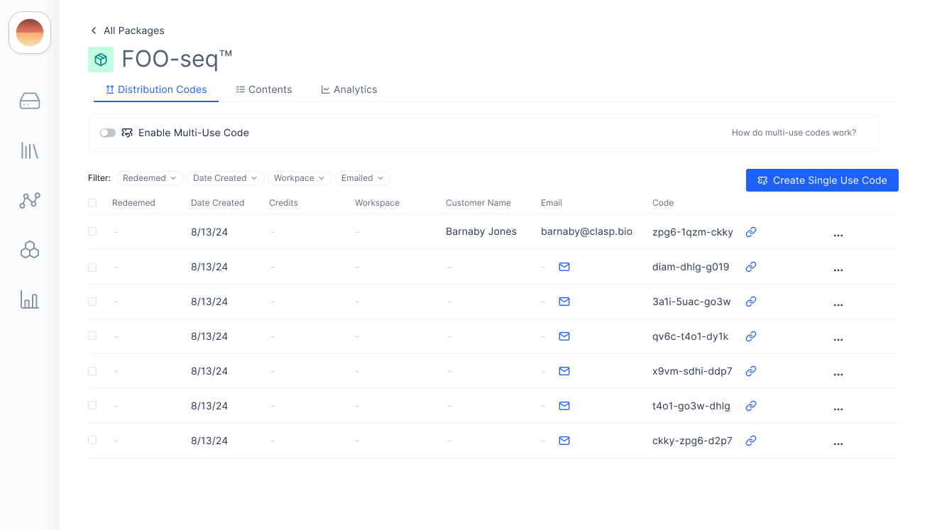 Codes are created for each kit and dashboards allow kit providers to monitor the redemption status of all of their customers.