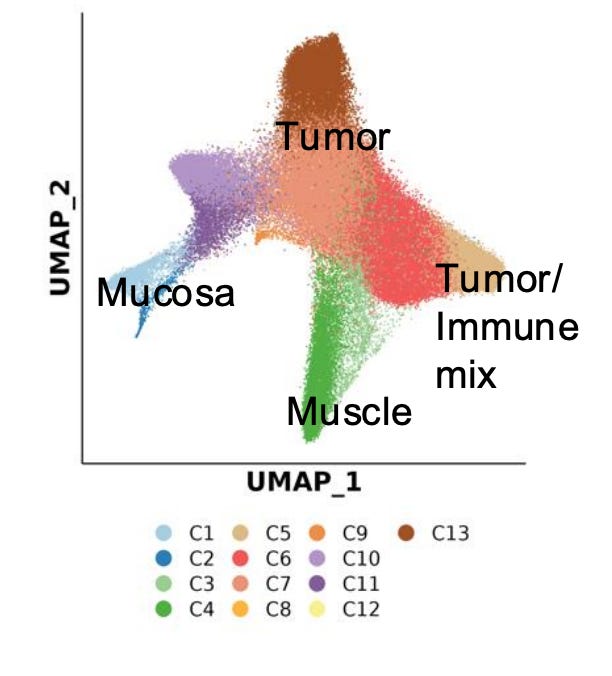 The UMAP projection below highlights major clusters including tumor, mucosa, muscle, and mixed tumor-immune states. When integrated with spatial mapping, these clusters align with morphological regions of the tissue, revealing how chromatin accessibility defines functional neighborhoods within the tumor microenvironment.