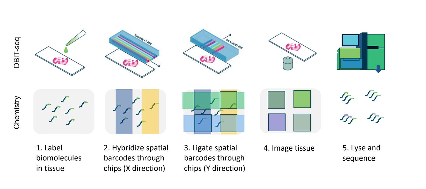 At the heart of these datasets is a technique called Deterministic Barcoding in Tissue sequencing (DBiT-seq), pioneered by AtlasXOmics. DBiT-seq uses microfluidic chips to flow barcoded oligonucleotides across tissue sections. Each intersection of these flows marks a defined spatial coordinate, which can then be linked to sequencing reads.