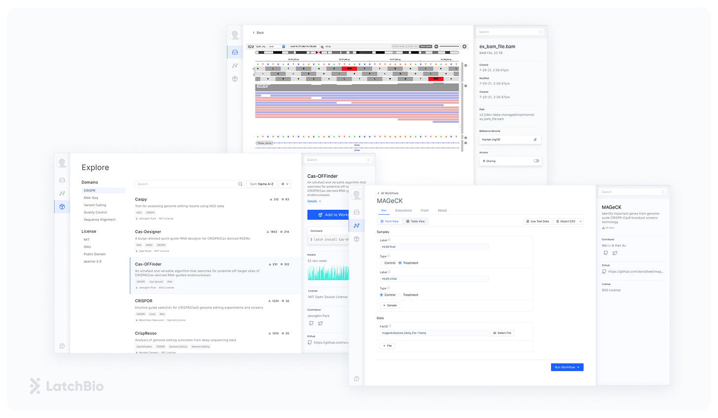 The LatchBio web platform lets biologists run CRISPR computational analysis without code and it follows a simple loop: upload data, find a workflow, run a workflow on your data, and visualize the results. The cloud-native data store lets biologists bring in data from their computers, Illumina BaseSpace, Benchling, and Amazon’s S3. The workflow explore lets them browse and run dozens of pre-loaded workflows (CRISPResso, Mageck, etc..), that were previously scattered across the web. Finally, the built-in visualizations allow for navigating sequence data effortlessly by running and launching PDFs, Genomic Browsers, or Quality Controls right in the browser.